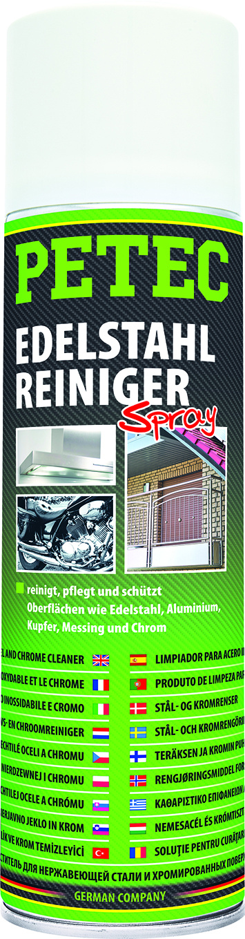 PETEC Edelstahlreiniger zum problemlosen und schnellen Reinigen, Pflegen und Schützen von glänzenden und metallischen Oberflächen (Edelstahl, Aluminium, Kupfer, Messing und Chrom) in einem Arbeitsgang. Beseitigt effektiv, materialschonend und streifenfrei Verunreinigungen wie Staub, Schmutz, Kalk, Fett, Flugrost, Fingerabdrücke, Öle und Harze. Hinterlässt einen glänzenden, schmutzund